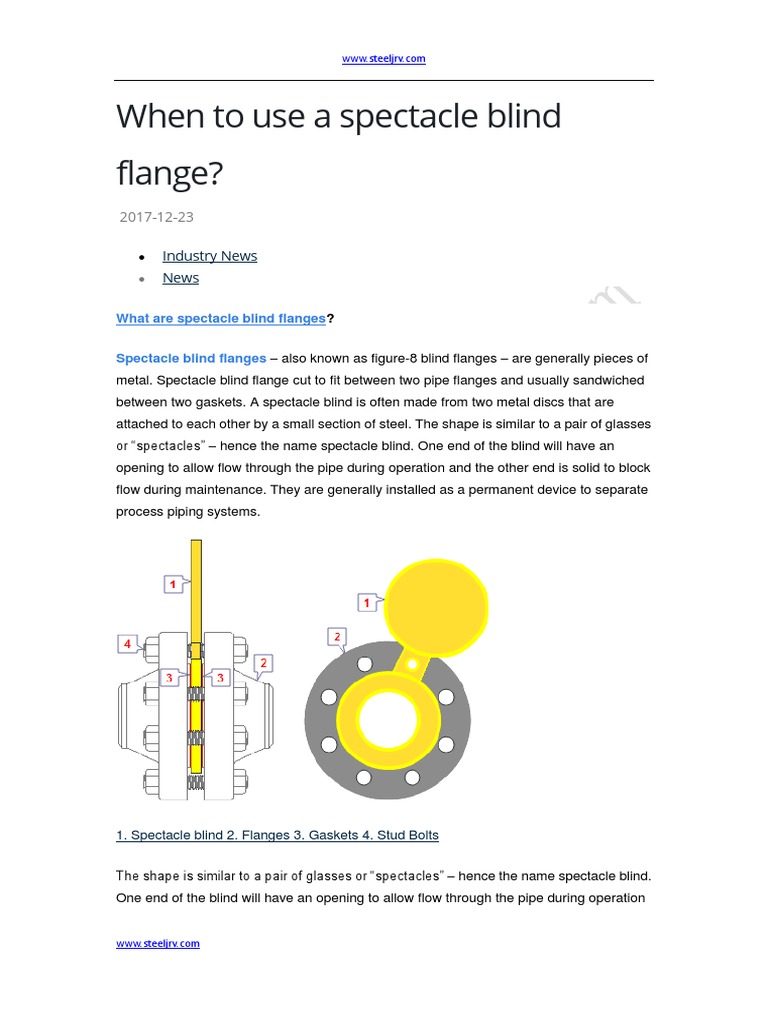 This kind of flange is generally a piece of metal than is cut to fit between two pipe flanges and usually sandwiched between two gaskets a spectacle blind is often made from two metal discs that are attached to each other by a small section of steel.